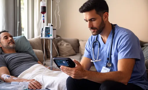 - Le traitement par perfusion à domicile avec suivi infirmier, y compris les perfusions intraveineuses à domicile, nutrition parentérale ou chimiothérapie prescrite.